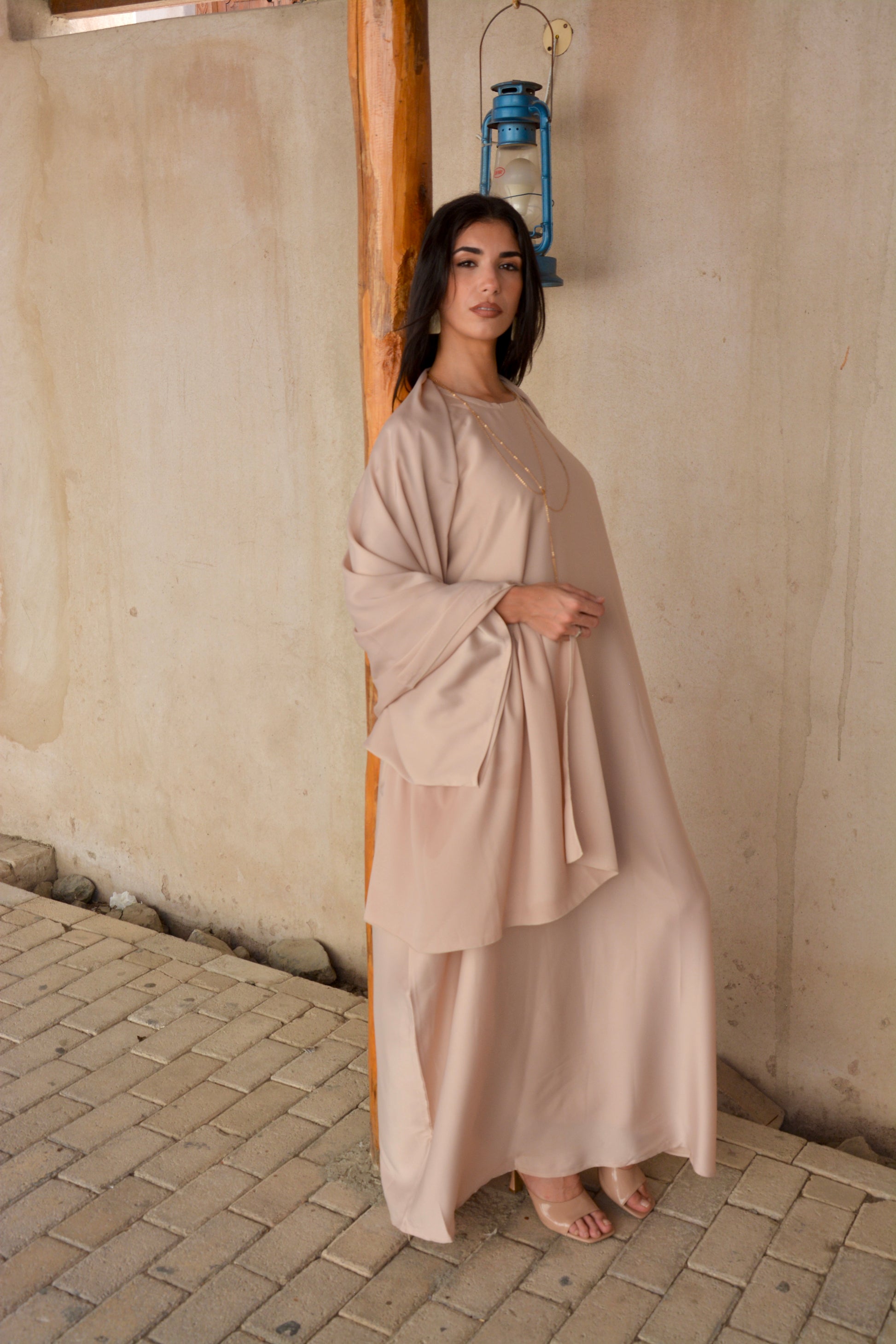 Pour parfaire l’ensemble, l’abaya est accompagnée d’un grand voile assorti, confectionné dans la même matière douce et vaporeuse, offrant une harmonie parfaite et un style irrésistiblement chic.